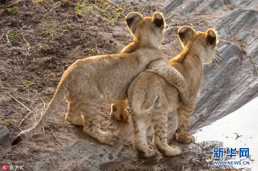 1月2日?qǐng)?bào)道(具體拍攝時(shí)間不詳),肯尼亞馬賽馬拉國家保護(hù)區(qū),64歲的攝影師Ingo Gelach在當(dāng)?shù)嘏臄z到一組有趣又暖心的照片。畫面中,兩頭小獅子站在水邊,似乎正考慮跨越面前的水域。其中一頭獅子用前腳搭在同伴的肩膀上,似乎在表達(dá)友好,又似是在鼓勵(lì)同伴不要害怕,勇敢地跨過去。(圖片來源:東方IC)
