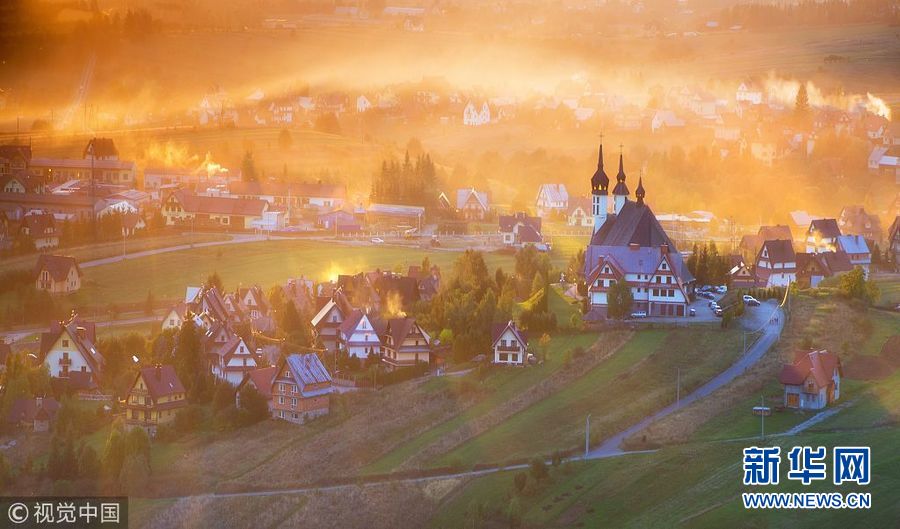 1月10日訊(具體拍攝時間不詳),波蘭皮耶尼內(nèi)山脈的一個村莊被濃霧籠罩,攝影師站在對面山上拍攝的景觀如童話世界一般,色彩繽紛的房子在濃霧中若隱若現(xiàn)仿若仙境。(圖片來源:視覺中國)