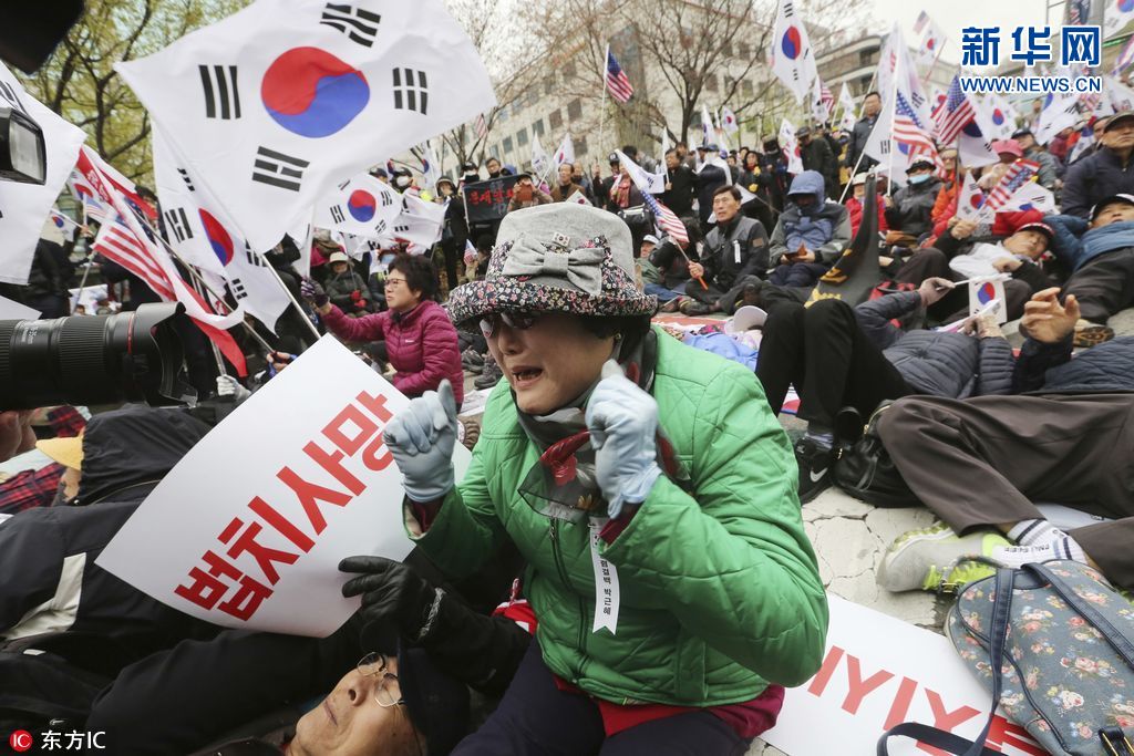 當(dāng)?shù)貢r間2018年4月6日,韓國首爾,在首爾中央地方法院前,韓國前總統(tǒng)樸槿惠的支持者在得知樸槿惠一審獲刑24年后,舉行集會游行。據(jù)報道,首爾中央地方法院對韓國前總統(tǒng)樸槿惠作出一審宣判,判處其有期徒刑24年,罰款180億韓元(約合人民幣1.06億元)。(圖片來源:東方IC)