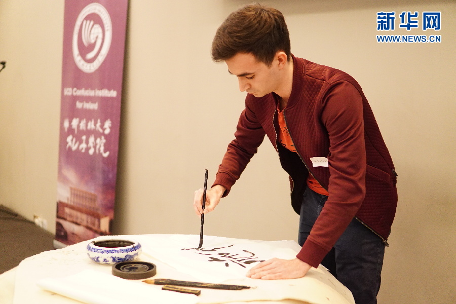 參賽者在表演中國(guó)書(shū)法。4月7日,第17屆“漢語(yǔ)橋”世界大學(xué)生中文比賽愛(ài)爾蘭賽區(qū)選拔賽在首都都柏林舉行。新華網(wǎng)發(fā)