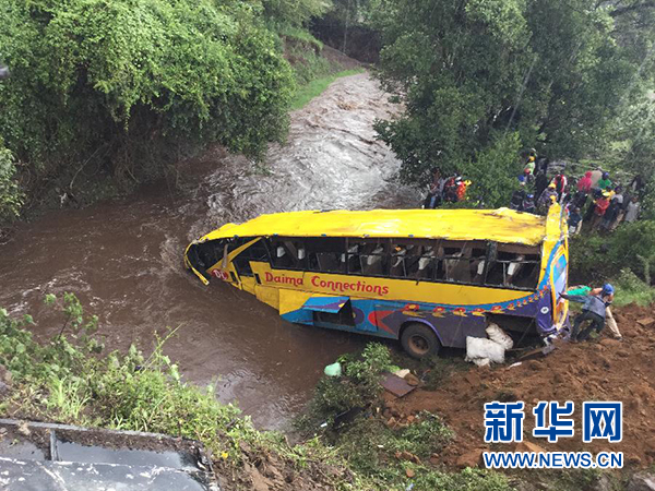 這是4月10日在肯尼亞西南部納羅克郡拍攝的墜入河中的客車(chē)。新華社發(fā)(羅伯特·馬尼亞拉攝)