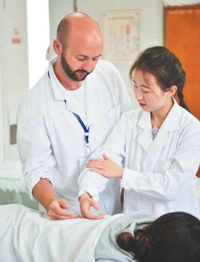 2017年7月,11名西班牙“洋中醫(yī)”來到位于昆明市的云南省中醫(yī)院學(xué)習(xí)推拿和針灸。圖為中國(guó)老師指導(dǎo)“洋中醫(yī)”。人民視覺