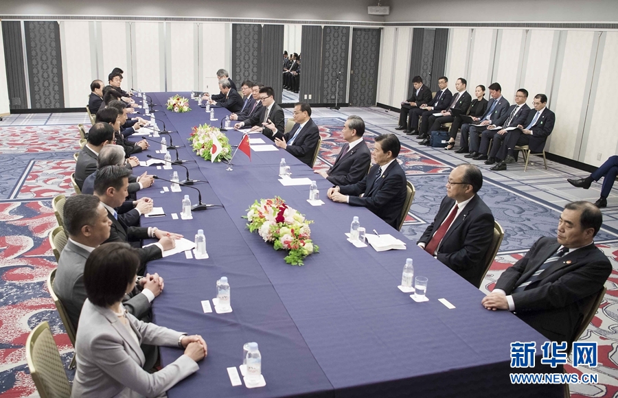 當?shù)貢r間5月10日下午,國務(wù)院總理李克強在東京下榻飯店會見日本在野黨負責人。新華社記者 李濤 攝