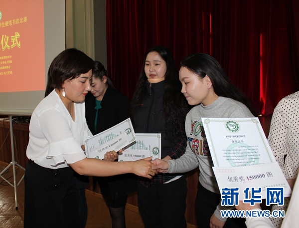 5月11日,蒙古國第六屆大中學(xué)生漢字硬筆書法比賽頒獎(jiǎng)儀式現(xiàn)場。新華網(wǎng)發(fā) 意特格樂攝