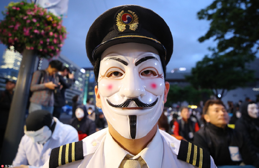 當(dāng)?shù)貢r(shí)間2018年5月18日,韓國(guó)首爾,大韓航空有限公司的飛行員戴著蓋伊·??怂姑婢撸谑谞柺袇^(qū)集會(huì)抗議,反對(duì)大韓航空會(huì)長(zhǎng)兼首席執(zhí)行官趙亮鎬及其家庭。