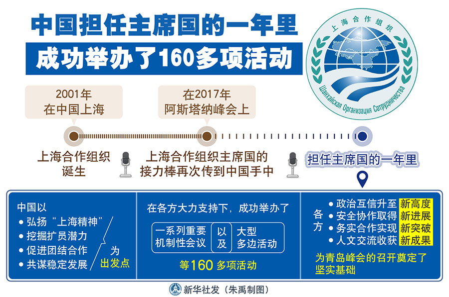 王毅指出,17年前,上海合作組織誕生于中國。在去年阿斯塔納峰會上,上海合作組織主席國的接力棒再次傳到中國手中。擔(dān)任主席國的一年里,我們以弘揚(yáng)“上海精神”、挖掘擴(kuò)員潛力、促進(jìn)團(tuán)結(jié)合作、共謀穩(wěn)定發(fā)展為出發(fā)點(diǎn),在各方大力支持下,成功舉辦了一系列重要機(jī)制性會議以及大型多邊活動等160多項(xiàng)活動。各方政治互信升至新高度,安全協(xié)作取得新進(jìn)展,務(wù)實(shí)合作實(shí)現(xiàn)新突破,人文交流收獲新成果,為青島峰會的召開奠定了堅(jiān)實(shí)基礎(chǔ)。