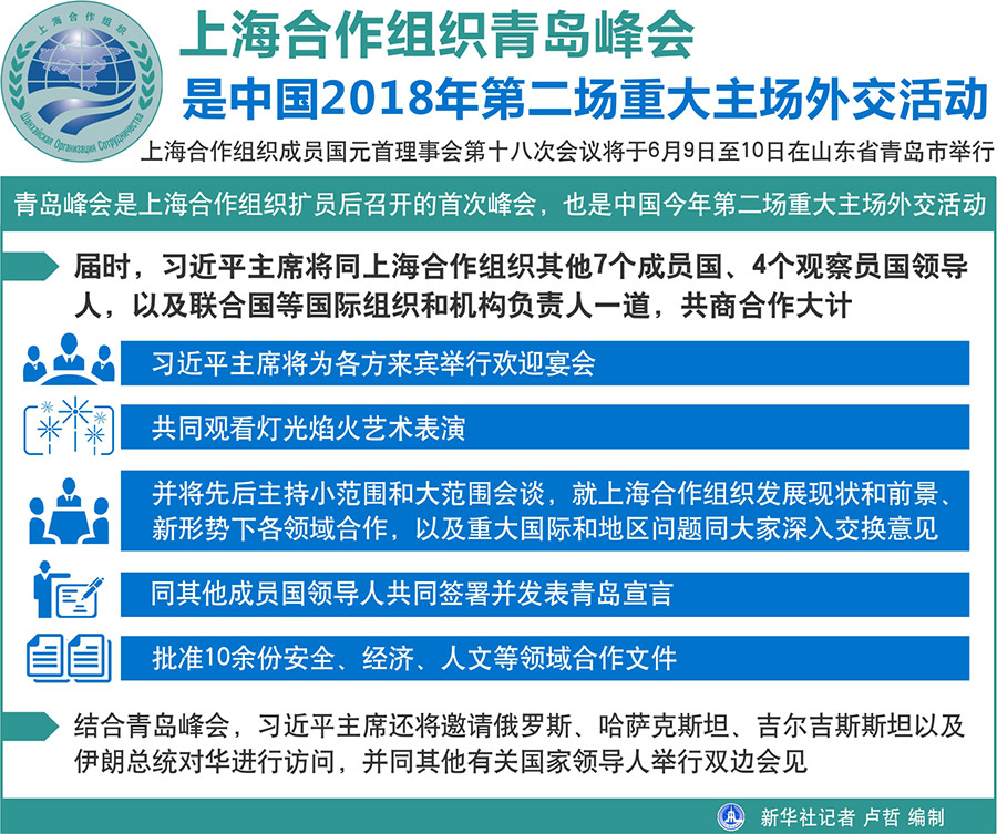王毅宣布,上海合作組織成員國元首理事會第十八次會議將于6月9日至10日在山東省青島市舉行。中國國家主席習(xí)近平將主持會議并舉行相關(guān)活動。上海合作組織成員國、觀察員國領(lǐng)導(dǎo)人和有關(guān)國際組織負(fù)責(zé)人將應(yīng)邀與會。