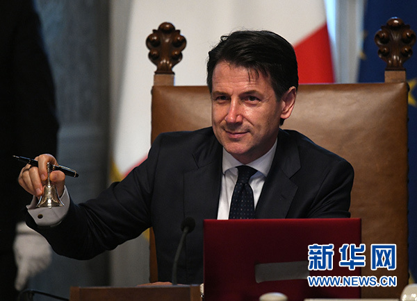 6月1日,在意大利羅馬,新政府總理孔特在主持第一次內(nèi)閣會議時搖鈴。新華社發(fā)(阿爾貝托·林格里亞 攝)
