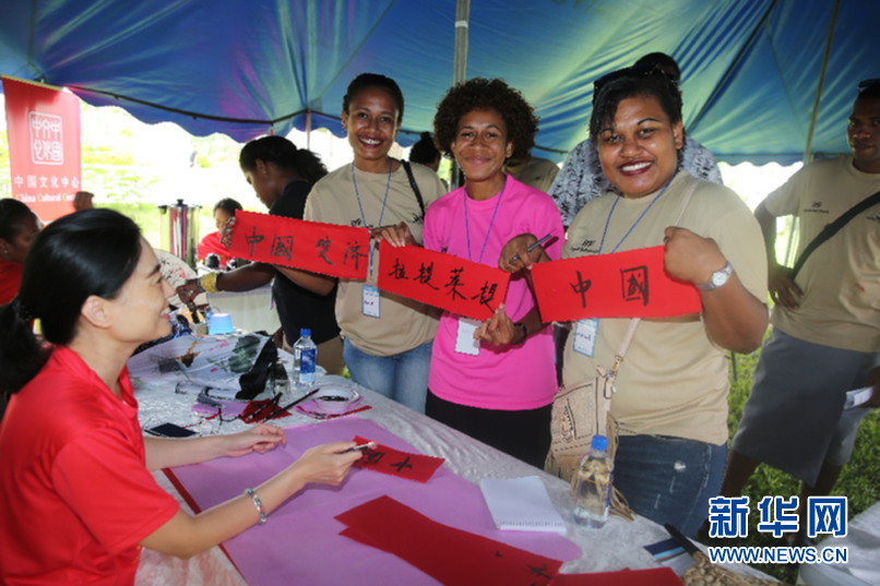 斐濟青少年在展示她們的毛筆字杰作。 新華網(wǎng)記者張永興 攝