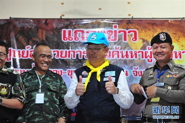 7月10日,在泰國(guó)清萊,清萊府府尹那榮薩(右二)在新聞發(fā)布會(huì)上慶祝救援成功。新華社發(fā)(拉亨 攝)