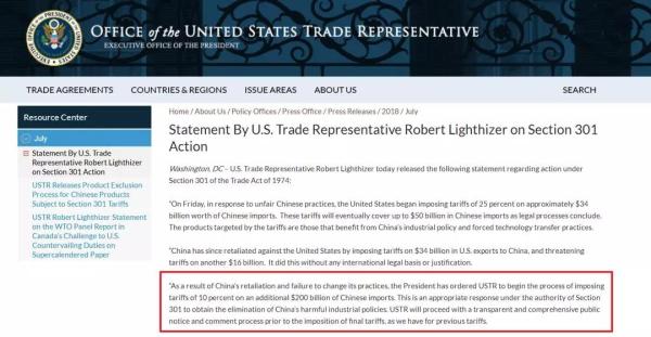 第二,強調(diào)中國不聽勸,未按其要求“限期整改”——聲明稱,過去一年,特朗普政府“耐心”敦促中國停止原有做法、開放市場、參與真正的市場競爭,并給出了“清晰和詳細”的具體改變要求,但中國“并未改變令美國經(jīng)濟未來處于風險的行為”,反而開始報復(fù)美國產(chǎn)品,這樣做“缺乏任何國際法理基礎(chǔ)或理由”。所以他們覺得,原有的力度不夠了,要再加加碼,“這是美國在301條款授權(quán)下對消除中國‘有害’產(chǎn)業(yè)政策做出的合適回應(yīng)”。(就奇怪怎么這個301條款哪兒哪兒都好使?)