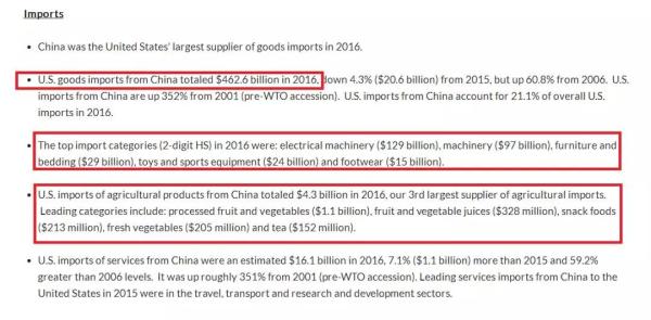 首先,從中方向美方的出口結(jié)構(gòu)來看:2016年美國從中國進口總值4626億美元,是美國最大的商品供給方。進口額最高的是電子機械類產(chǎn)品(1290億美元),機器(970億美元),家具及寢具(290億美元),玩具及運動裝備(240億美元),鞋類(150億美元)。此外,從中國進口的農(nóng)產(chǎn)品總額43億美元(這已經(jīng)是美國第三大農(nóng)產(chǎn)品供應(yīng)方了),其中占比最高的是加工后的水果及蔬菜(11億美元),水果及蔬菜汁(3.28億美元),快餐休閑類食品(2.13億美元),新鮮蔬菜(2.05億美元)及茶葉(1.52億美元)。
