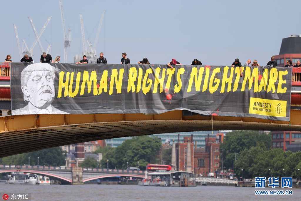 7月12日,英國(guó)倫敦,國(guó)際特赦組織成員在倫敦泰晤士河上沃克斯豪爾橋懸掛橫幅,抗議美國(guó)總統(tǒng)特朗普到訪英國(guó)。(圖片來(lái)源:東方IC)