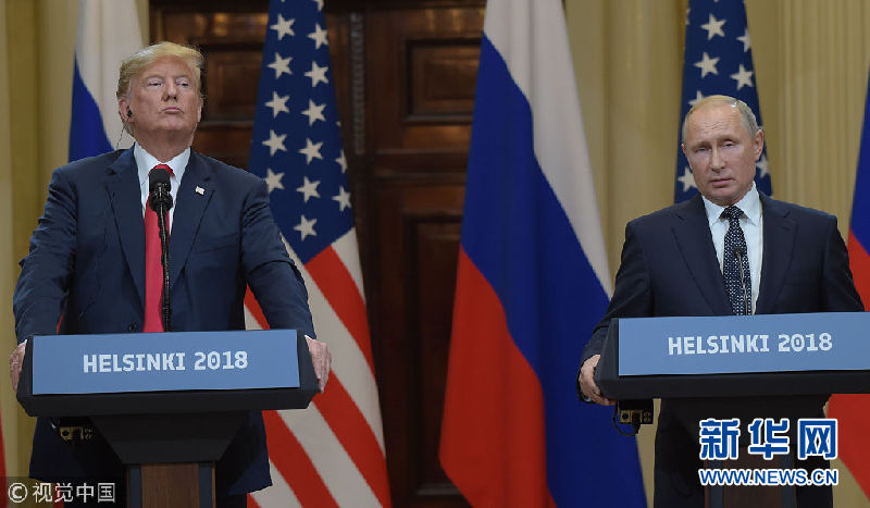 當?shù)貢r間2018年7月16日,芬蘭赫爾辛基,美國總統(tǒng)特朗普與俄羅斯總統(tǒng)普京出席聯(lián)合新聞發(fā)布會。(圖片來源:視覺中國)