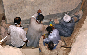 7月19日,考古人員在埃及亞歷山大的石棺開(kāi)啟現(xiàn)場(chǎng)工作。 埃及文物部19日宣布,考古人員近日在埃及北部地中海沿岸城市亞歷山大發(fā)現(xiàn)一口裝有三具古代武士遺骸的石棺。 新華社發(fā)