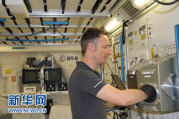 7月18日,在德國科隆,德國宇航員馬天(馬蒂亞斯·毛雷爾)在歐洲航天局哥倫布實驗艙的模擬艙內(nèi)展示實驗操作。 新華社記者張毅榮攝