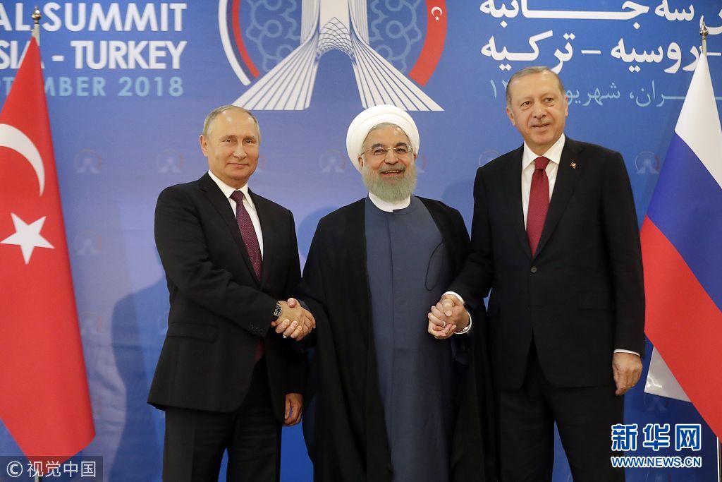 當(dāng)?shù)貢r(shí)間2018年9月7日,伊朗德黑蘭,當(dāng)日,俄羅斯、土耳其和伊朗三國(guó)首腦齊聚伊朗首都德黑蘭舉行峰會(huì),討論敘利亞局勢(shì)。(圖片來源:視覺中國(guó))