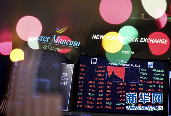 12月24日,美國紐約證券交易所的電子屏顯示當日交易信息。 紐約股市三大股指24日收盤下跌。截至當天收盤,道瓊斯工業(yè)平均指數比前一交易日下跌653.17點,收于21792.20點,跌幅為2.91%。標準普爾500種股票指數下跌65.52點,收于2351.10點,跌幅為2.71%。納斯達克綜合指數下跌140.08點,收于6192.92點,跌幅為2.21%。 新華社記者 王迎 攝