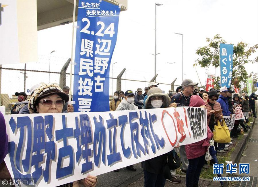 日本沖繩民眾在美軍營前集會(huì) 呼吁投票反對(duì)美軍基地搬遷計(jì)劃