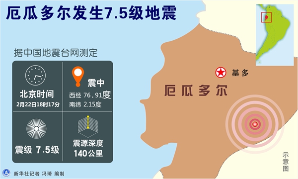 新華社北京2月22日電 據(jù)中國地震臺網(wǎng)正式測定,北京時間2019年2月22日18時17分,在厄瓜多爾(南緯2.15度,西經(jīng)76.91度)發(fā)生7.5級地震,震源深度140千米。