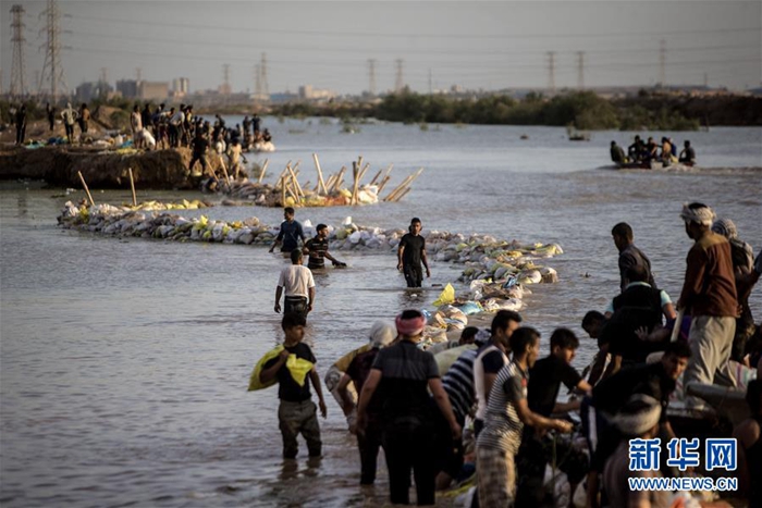 4月11日,在伊朗阿瓦士附近,人們在搭建防洪堤。近期,伊朗境內(nèi)持續(xù)洪澇災害。新華社發(fā)(艾哈邁德·哈拉比薩斯 攝)
