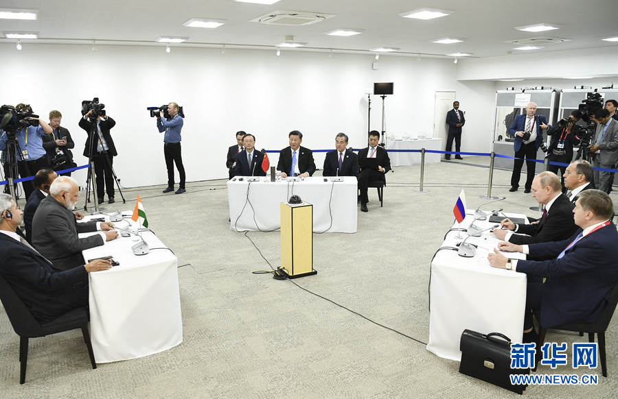 6月28日,國家主席習(xí)近平在大阪出席中俄印領(lǐng)導(dǎo)人會晤,同俄羅斯總統(tǒng)普京、印度總理莫迪就當(dāng)前國際形勢、重大國際和地區(qū)問題、三方合作深入交換意見。 新華社記者 謝環(huán)馳 攝