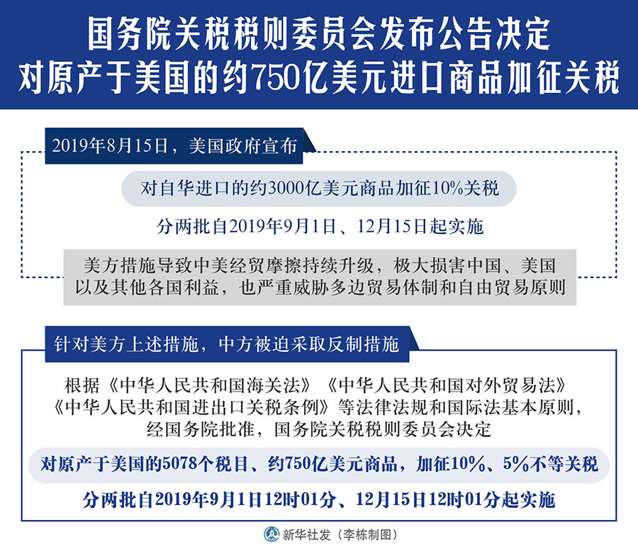 國務(wù)院關(guān)稅稅則委員會(huì)發(fā)布公告決定對(duì)原產(chǎn)于美國的約750億美元進(jìn)口商品加征關(guān)稅-新華網(wǎng)