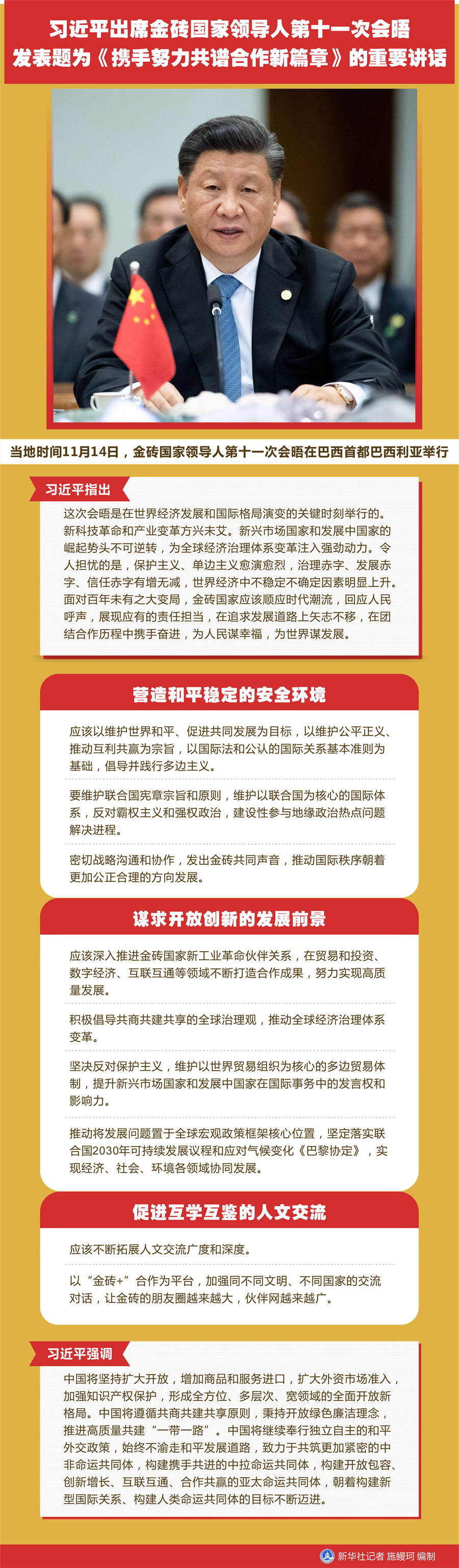 圖表:習近平出席金磚國家領導人第十一次會晤 發(fā)表題為《攜手努力共譜合作新篇章》的重要講話 新華社記者 施鰻珂 編制