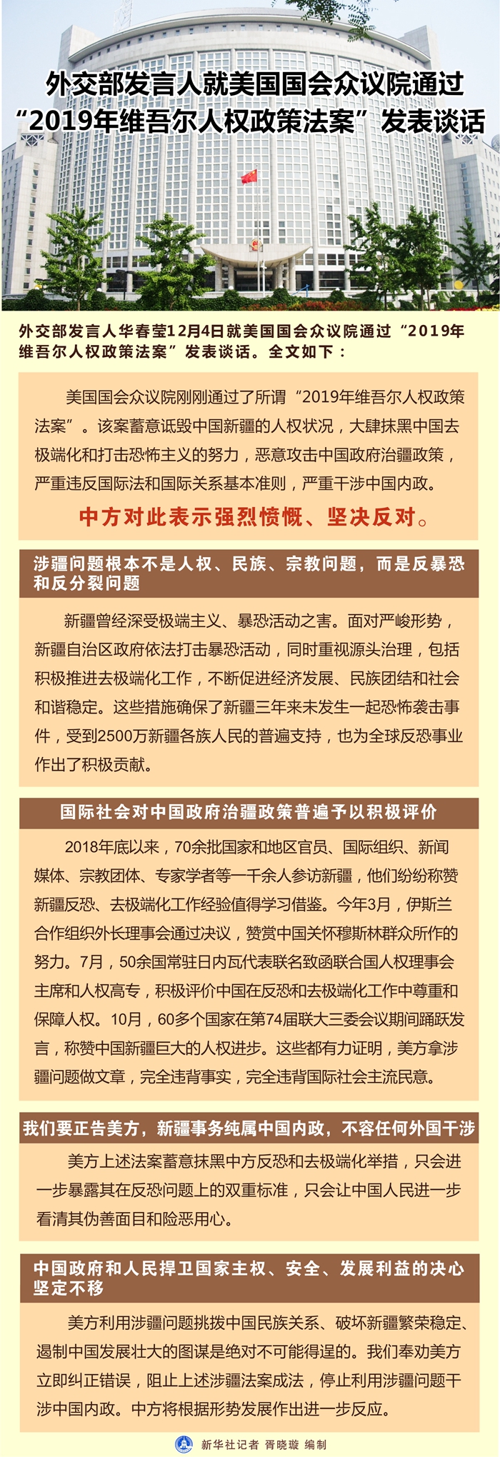 新華社北京12月4日電 外交部發(fā)言人華春瑩4日就美國國會(huì)眾議院通過“2019年維吾爾人權(quán)政策法案”發(fā)表談話。全文如下: