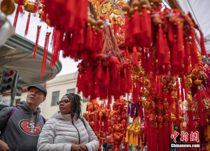 市民在舊金山“中國城”的春節(jié)花市上被各種飾品吸引。中新社記者 劉關關 攝