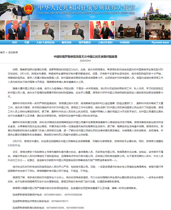莫斯科市政府采取一系列嚴(yán)格防疫措施后,我館通過(guò)俄外交部、俄消費(fèi)者權(quán)益保護(hù)和公益監(jiān)督署(防疫主管部門(mén))、莫斯科市政府等做了大量工作。俄方多次強(qiáng)調(diào),所采取的措施并非只針對(duì)中國(guó)公民。使館在工作中注意到,俄執(zhí)法部門(mén)對(duì)本國(guó)公民和其他國(guó)家公民也進(jìn)行了防疫檢查,使館工作人員上街時(shí)也曾受到詢問(wèn)。據(jù)了解,莫斯科市執(zhí)法人員總體上執(zhí)法規(guī)范,檢查護(hù)照確認(rèn)入境時(shí)間超過(guò)14天后即予放行。如中國(guó)公民遇到過(guò)度執(zhí)法行為或遭遇不公正待遇,請(qǐng)如實(shí)向使館反映。我館將切實(shí)維護(hù)中國(guó)公民的合法權(quán)益。