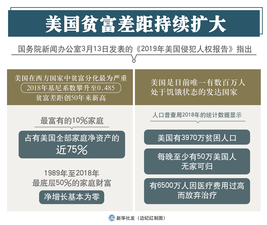 新華社北京3月13日電(記者王子銘、李超)國務院新聞辦13日發(fā)表的《2019年美國侵犯人權報告》指出,美國國民收入分配差距持續(xù)擴大,底層民眾生活苦不堪言。