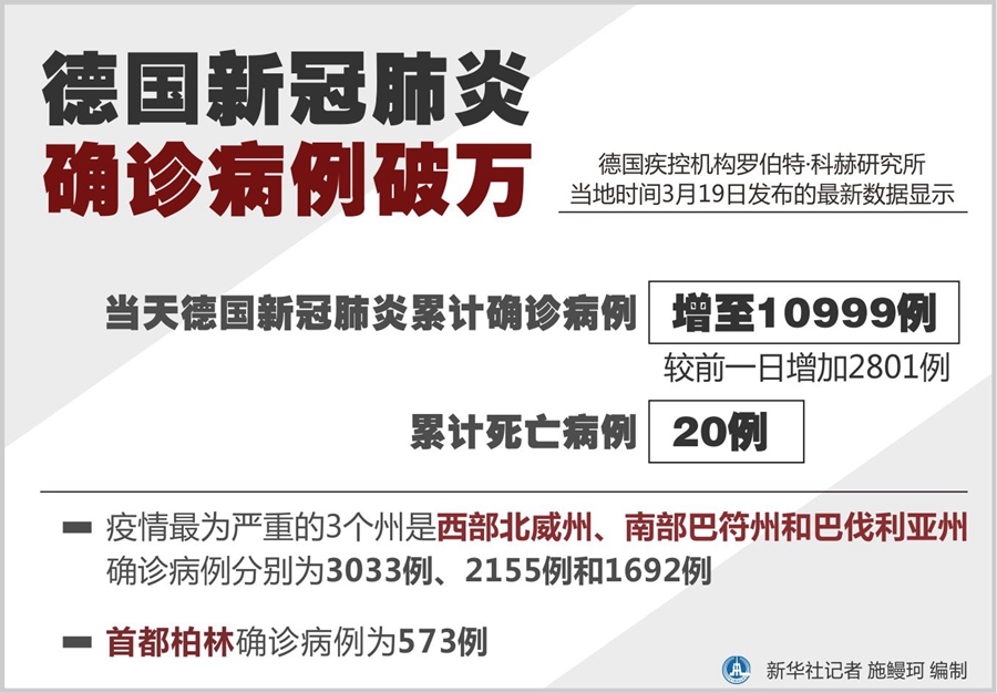新華社柏林3月19日電(記者張毅榮 田穎)德國(guó)疾控機(jī)構(gòu)羅伯特·科赫研究所19日發(fā)布的最新數(shù)據(jù)顯示,當(dāng)天德國(guó)新冠肺炎累計(jì)確診病例增至10999例,較前一日增加2801例,累計(jì)死亡病例20例。