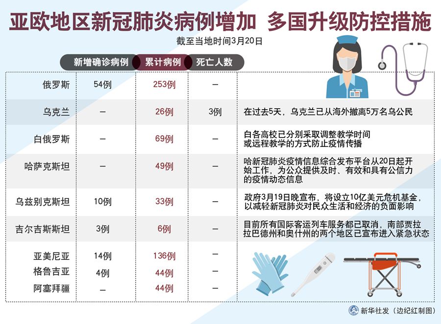 新華社莫斯科3月21日電 綜合新華社駐亞歐地區(qū)記者報(bào)道:亞歐地區(qū)新冠肺炎確診病例20日繼續(xù)增加,多國(guó)采取暫??瓦\(yùn)等防控措施。