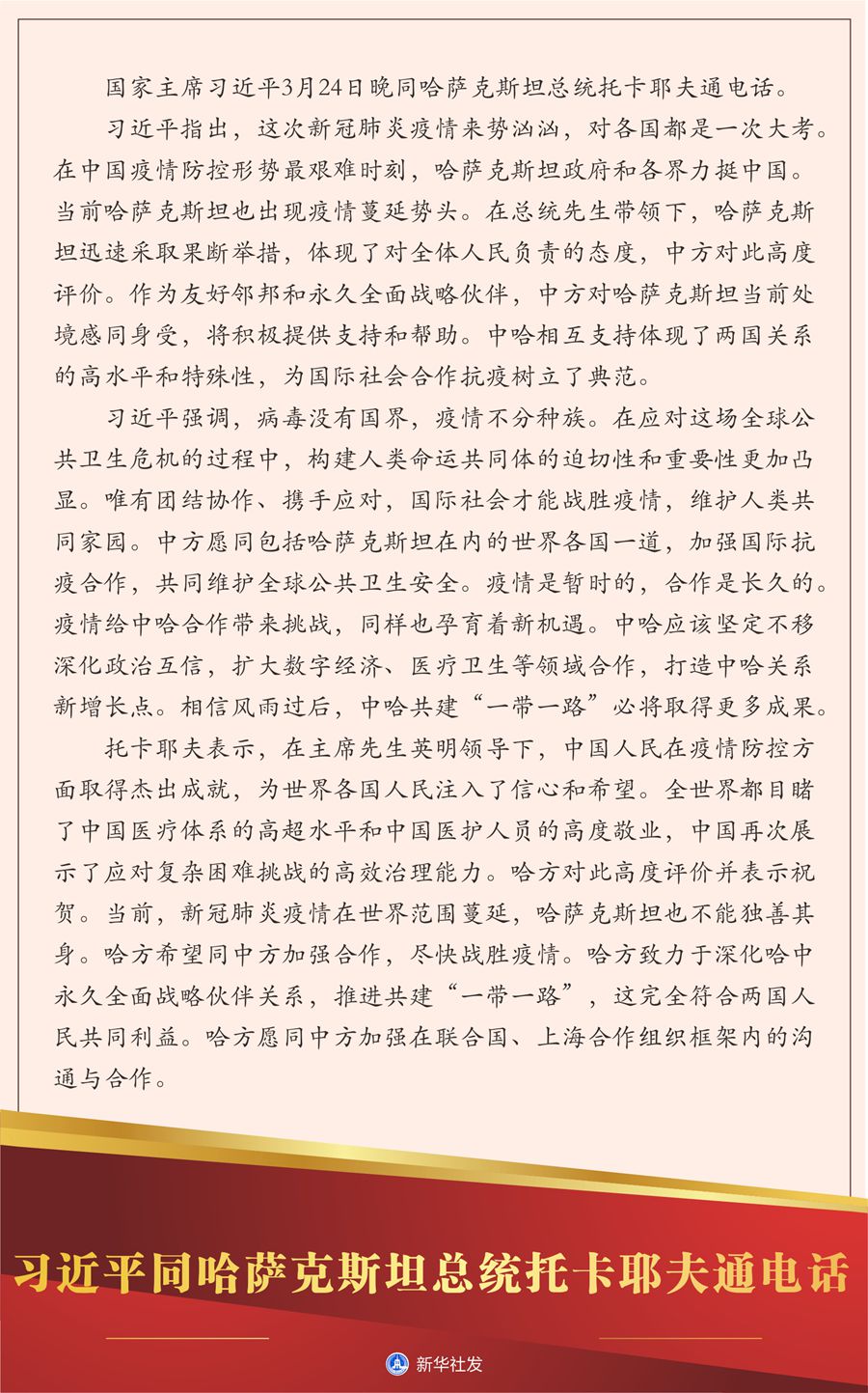 習(xí)近平指出,這次新冠肺炎疫情來勢洶洶,對各國都是一次大考。在中國疫情防控形勢最艱難時刻,哈薩克斯坦政府和各界力挺中國。當(dāng)前哈薩克斯坦也出現(xiàn)疫情蔓延勢頭。在總統(tǒng)先生帶領(lǐng)下,哈薩克斯坦迅速采取果斷舉措,體現(xiàn)了對全體人民負(fù)責(zé)的態(tài)度,中方對此高度評價。作為友好鄰邦和永久全面戰(zhàn)略伙伴,中方對哈薩克斯坦當(dāng)前處境感同身受,將積極提供支持和幫助。中哈相互支持體現(xiàn)了兩國關(guān)系的高水平和特殊性,為國際社會合作抗疫樹立了典范。