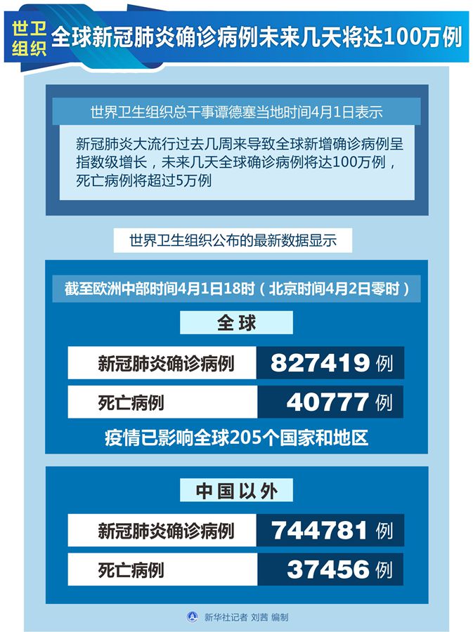 新華社日內瓦4月1日電(記者劉曲)世界衛(wèi)生組織總干事譚德塞4月1日表示,新冠肺炎大流行過去幾周來導致全球新增確診病例呈指數級增長,未來幾天全球確診病例將達100萬例,死亡病例將超過5萬例。