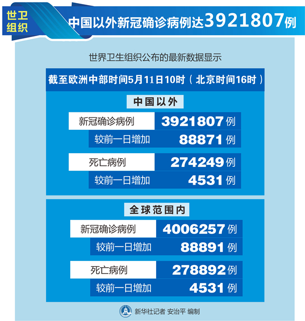 新華社日內(nèi)瓦5月11日電(記者劉曲)世界衛(wèi)生組織11日公布的最新數(shù)據(jù)顯示,中國(guó)以外新冠確診病例達(dá)到3921807例。