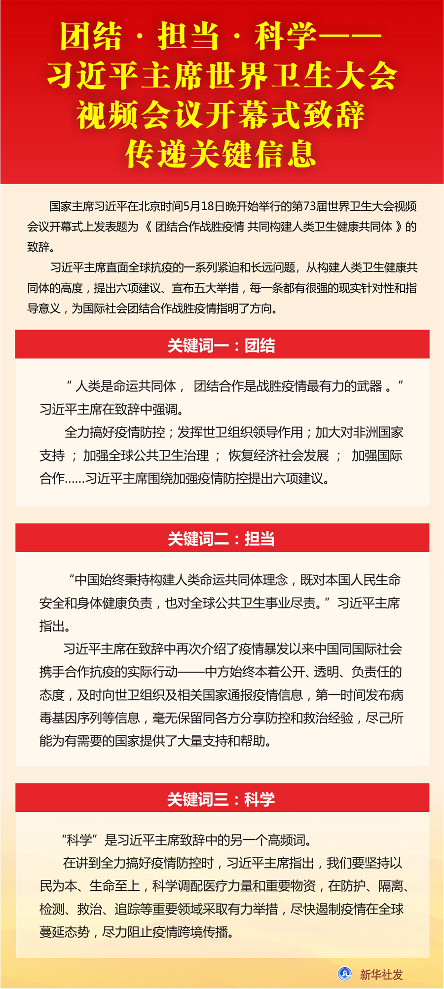 新華社北京5月18日電? 綜合新華社駐外記者報道:國家主席習(xí)近平18日晚在第73屆世界衛(wèi)生大會視頻會議開幕式上發(fā)表題為《團結(jié)合作戰(zhàn)勝疫情 共同構(gòu)建人類衛(wèi)生健康共同體》的致辭。世界衛(wèi)生組織官員及多國人士認為,習(xí)近平主席在致辭中提出的加強疫情防控六項建議、中國為推進全球抗疫合作的五大舉措秉持構(gòu)建人類命運共同體理念,體現(xiàn)了中國負責(zé)任大國擔(dān)當,對推動抗擊疫情國際合作具有重要意義。