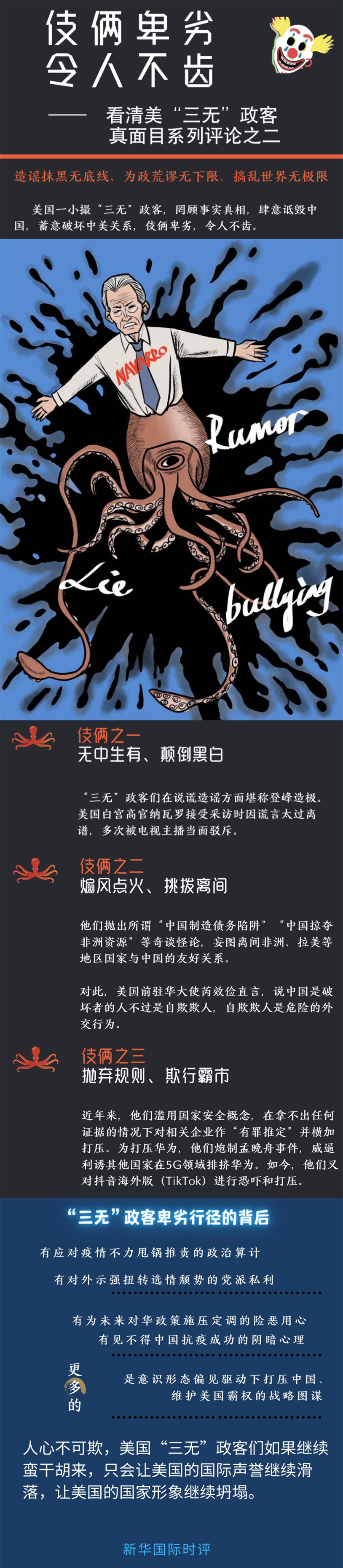 “三無”政客們的伎倆之一是無中生有、顛倒黑白。他們在說謊造謠方面堪稱登峰造極。美國白宮高官納瓦羅接受采訪時因謊言太過離譜,多次被電視主播當面駁斥。為了誣陷“中國政府在新疆侵犯人權”,美國駐華使領館日前在社交媒體上公然配發(fā)利用修圖軟件處理過的假圖片。中國外交部發(fā)言人指出,這再次證明,美方一些人為了詆毀攻擊中國,已經(jīng)到了沒有任何下限的地步。