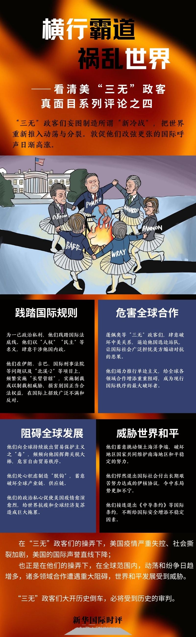 “三無”政客們的亂言與惡行,正在美國和國際上造成種種惡果。正是在他們的操弄下,美國疫情嚴重失控、社會撕裂加劇,美國的國際聲譽直線下降;也正是在他們的操弄下,在全球范圍內(nèi),動蕩和紛爭日趨增多,諸多領(lǐng)域合作遭遇重大阻礙,世界和平發(fā)展受到威脅?!叭裏o”政客們大開歷史倒車,必將受到歷史的審判。