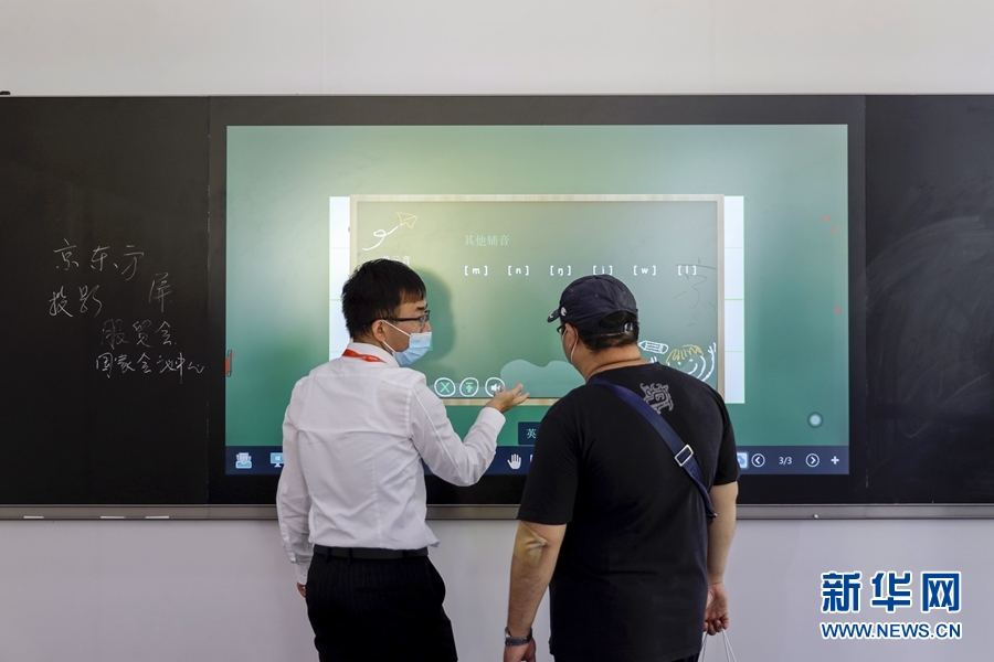 9月5日,一名男子在服貿(mào)會(huì)5G通信服務(wù)專題展區(qū)了解一款智慧黑板。此產(chǎn)品可實(shí)現(xiàn)普通黑板書(shū)寫、電子白板交互、數(shù)字資源調(diào)用、多媒體課件演示、音頻錄制、遠(yuǎn)程交互及直播等功能。 新華社記者 李木子 攝