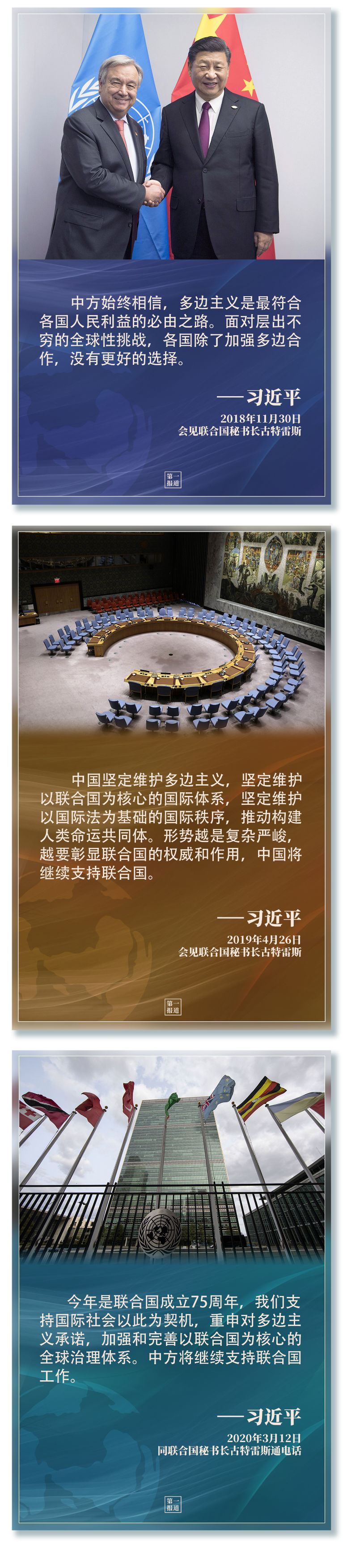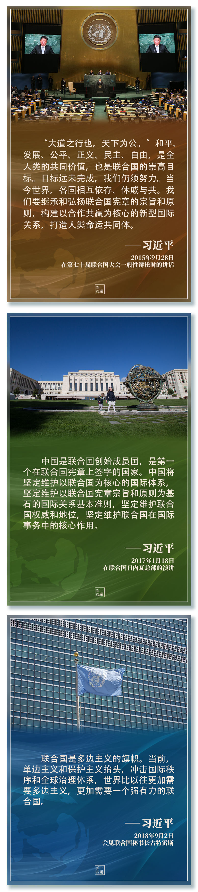 習(xí)主席指出,“支持聯(lián)合國(guó)發(fā)揮作用,維護(hù)聯(lián)合國(guó)權(quán)威和地位,是中國(guó)外交一項(xiàng)基本政策。”2013年以來,習(xí)主席多次會(huì)見聯(lián)合國(guó)主要官員,訪問聯(lián)合國(guó)總部及聯(lián)合國(guó)專門機(jī)構(gòu),出席一系列聯(lián)合國(guó)活動(dòng)……親自推動(dòng)中國(guó)同聯(lián)合國(guó)的合作,發(fā)出支持聯(lián)合國(guó)事業(yè)、捍衛(wèi)多邊主義的中國(guó)強(qiáng)音。