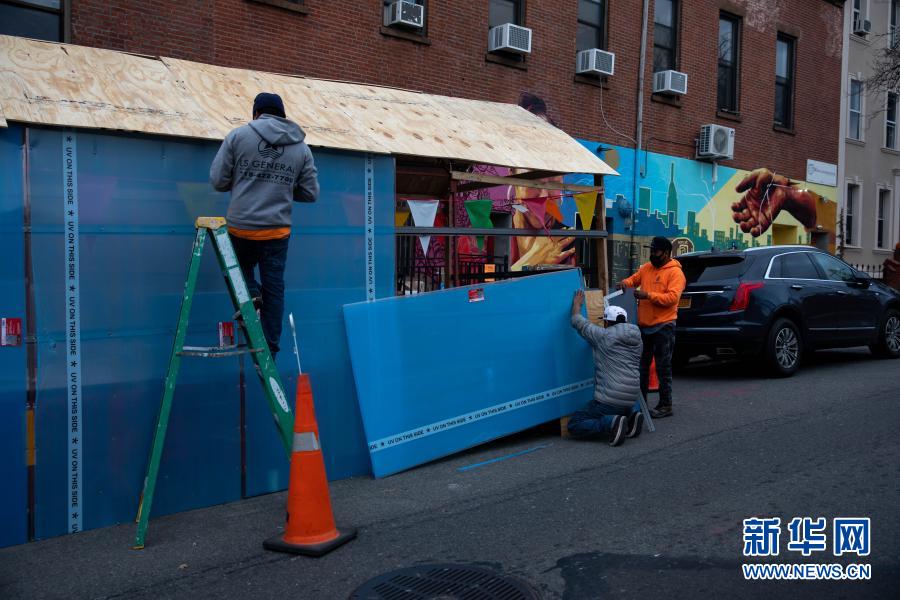 11月21日,在美國(guó)紐約,工人為一處戶外就餐區(qū)安裝保暖材料。新華社發(fā)(郭克 攝)