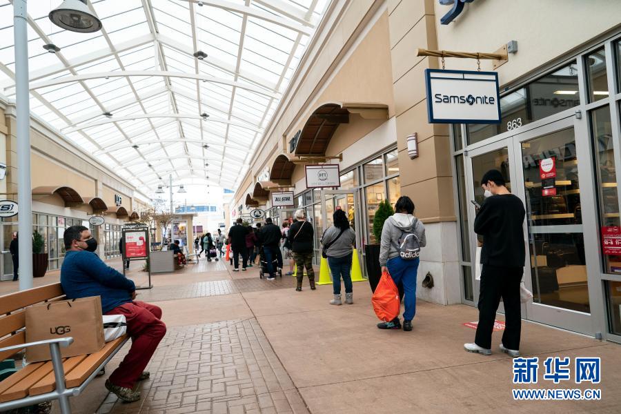 11月27日,人們?cè)诿绹?guó)馬里蘭州國(guó)家港灣一處購物中心排隊(duì)等待進(jìn)店購物。