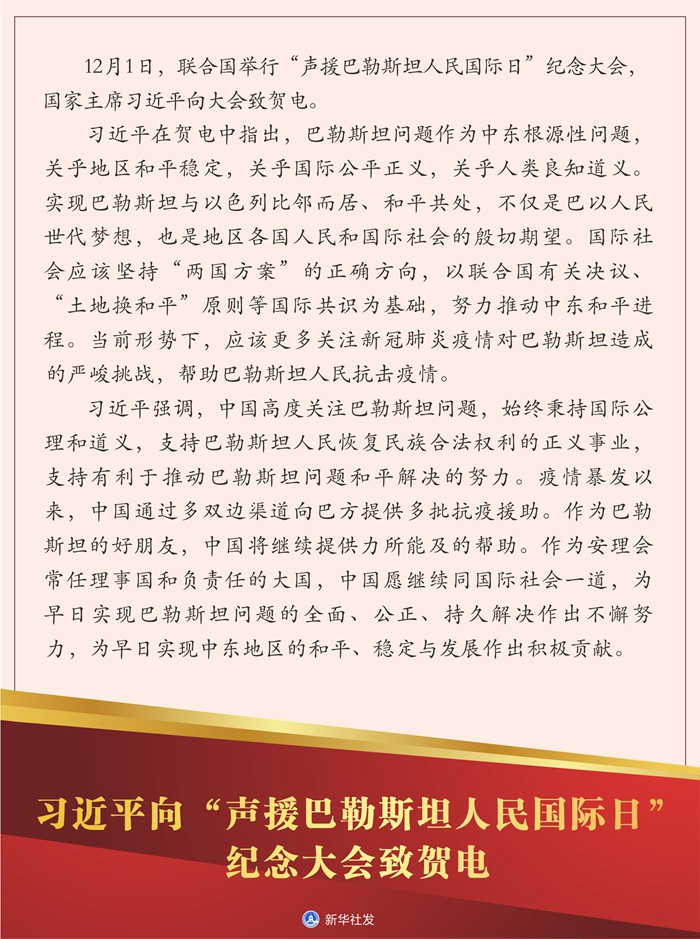 新華社北京12月2日電? 12月1日,聯(lián)合國(guó)舉行“聲援巴勒斯坦人民國(guó)際日”紀(jì)念大會(huì),國(guó)家主席習(xí)近平向大會(huì)致賀電。