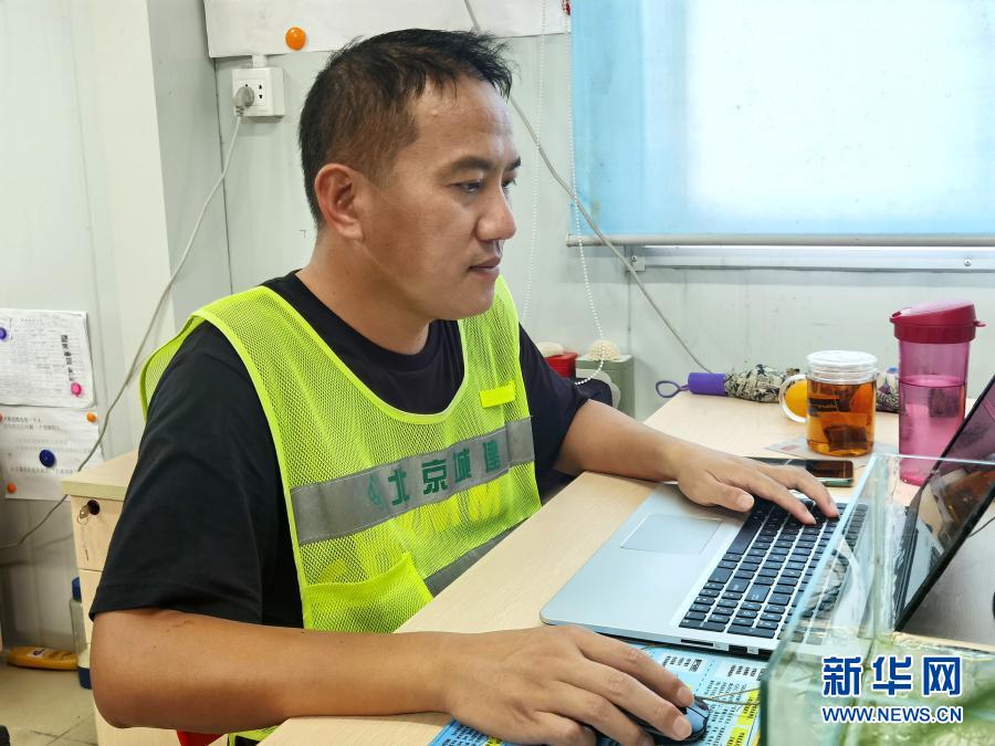12月14日,在馬爾代夫馬累,臉上有口罩印的安全工程師劉平建在維拉納國際機場水飛航站樓項目辦公室工作。新華社發(fā)(北京城建集團供圖)