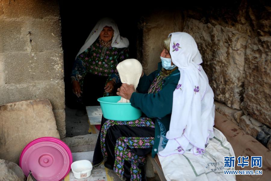 3月17日,78歲的拉比亞·阿布·卡巴什(右)和70歲的卡茲蘭·阿布·卡巴什在約旦河西岸城市希伯倫附近的一個(gè)村莊制作“塔本”烤餅。