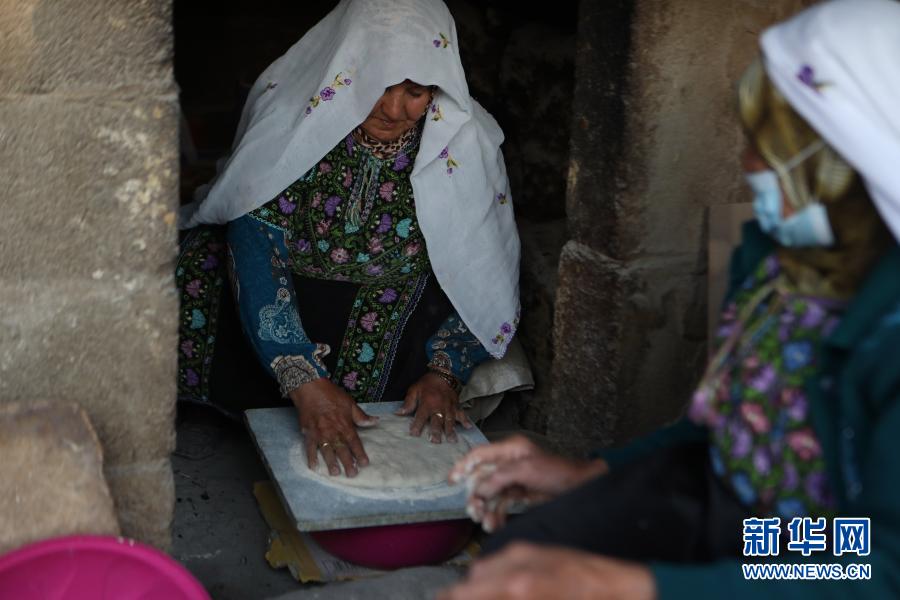 3月17日,70歲的卡茲蘭·阿布·卡巴什(左)和78歲的拉比亞·阿布·卡巴什在約旦河西岸城市希伯倫附近的一個村莊制作“塔本”烤餅。