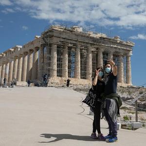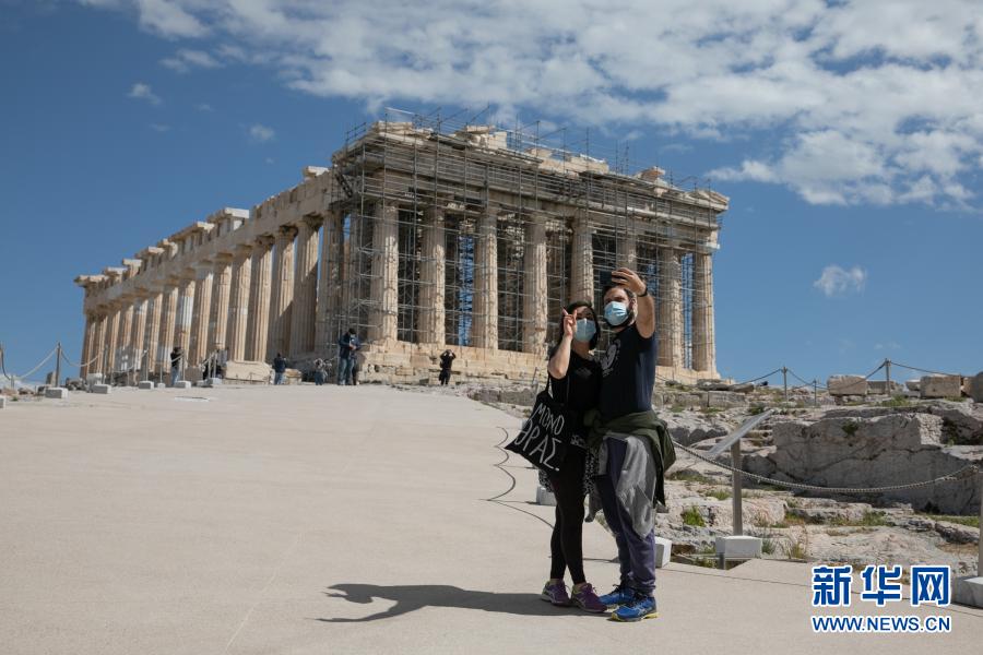 3月22日,游客在希臘雅典衛(wèi)城自拍。希臘露天考古遺跡22日起恢復(fù)開(kāi)放。游客需遵守保持社交距離和佩戴口罩等防疫規(guī)定。新華社發(fā)(萊夫特里斯·帕察里斯攝)