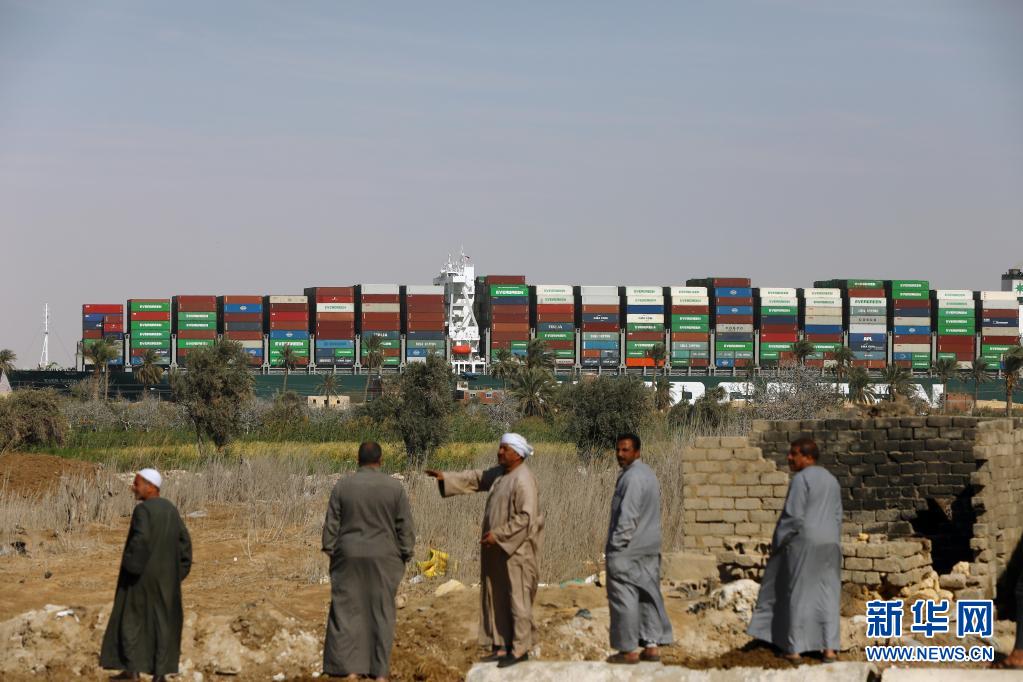 這是3月29日拍攝的移動至埃及蘇伊士運(yùn)河正常航道上的重型貨輪。